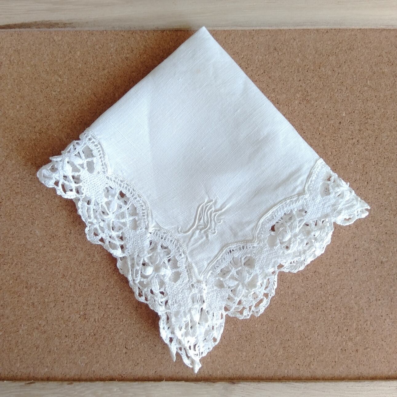 【22㎝×20㎝】モノグラム入りアンティークレースハンカチ