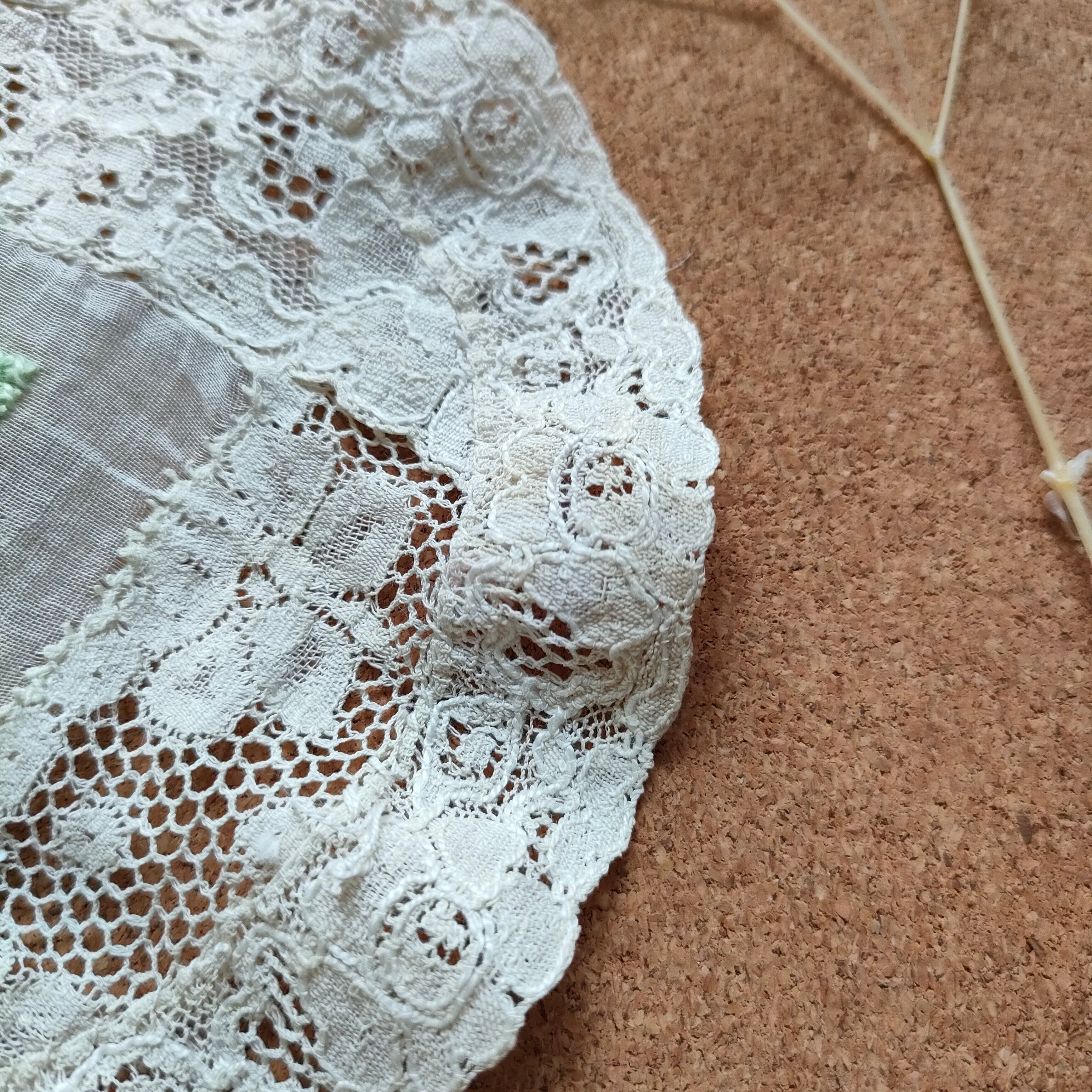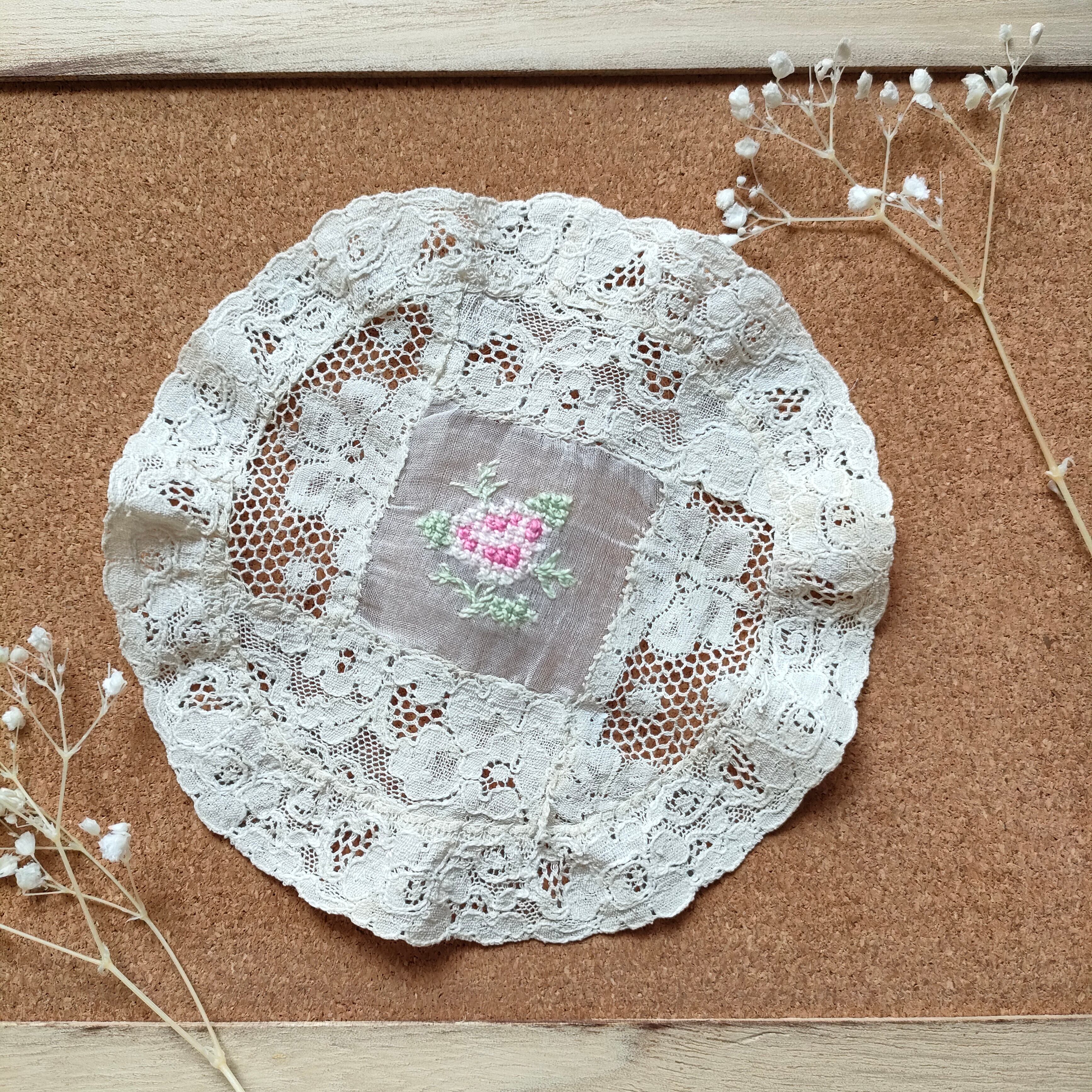 ピンクのお花の刺繍された薄い布と、複数のレースが手縫いで縫い合わされており、手作りの風合いが楽しめます。