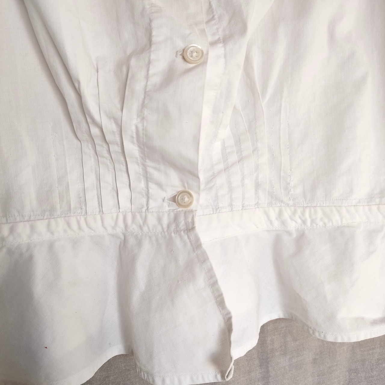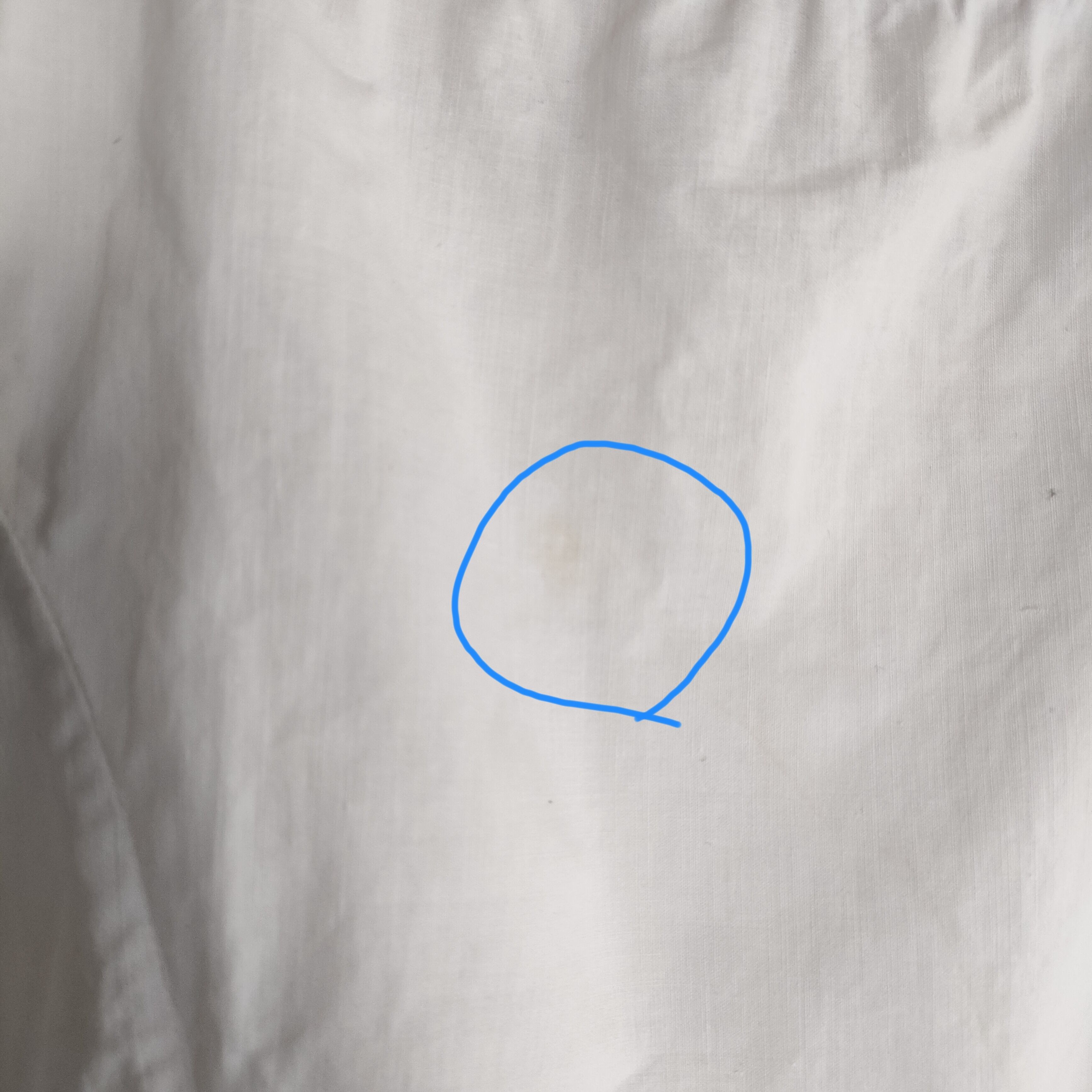 イニシャル刺繍、貝ボタンなどの作り方は古いものですが、縫い目がミシンなので比較的新しい1950-60年代頃のものかもしれません。